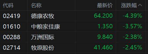 港股(gu)猪肉概念股(gu)集体走低,其(qi)中,德(de)康农牧跌超4%,中粮家佳康跌3.6%并且(qie)录得4连跌,牧原股(gu)份(fen)、万(wan)洲(zhou)国际跌超2%。