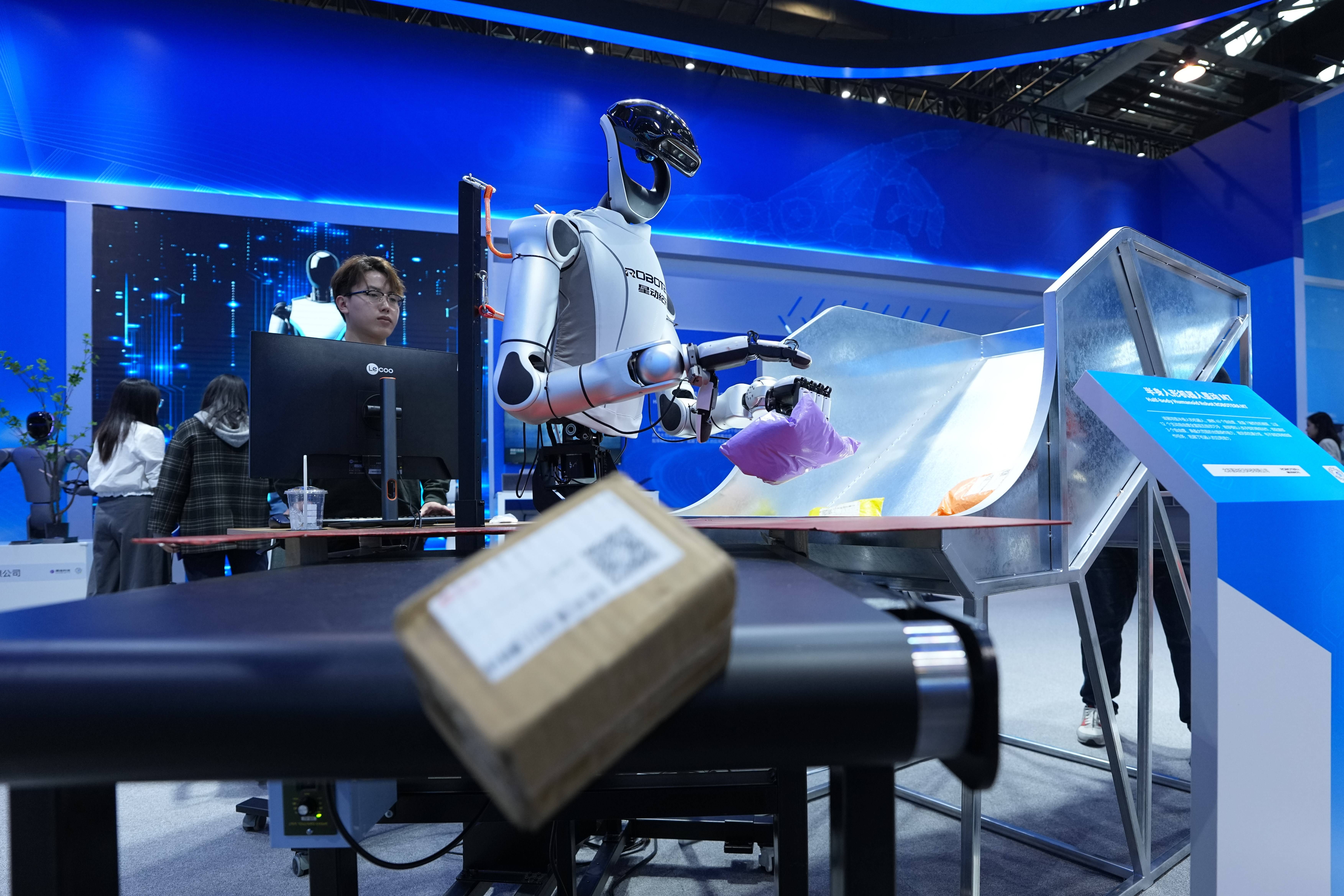 在中关村展示中心常设展上,一台(tai)半身人形(xing)机器人在进行包裹分拣展示(3月(yue)25日摄)。 新华社(she)记者 鞠焕(huan)宗 摄