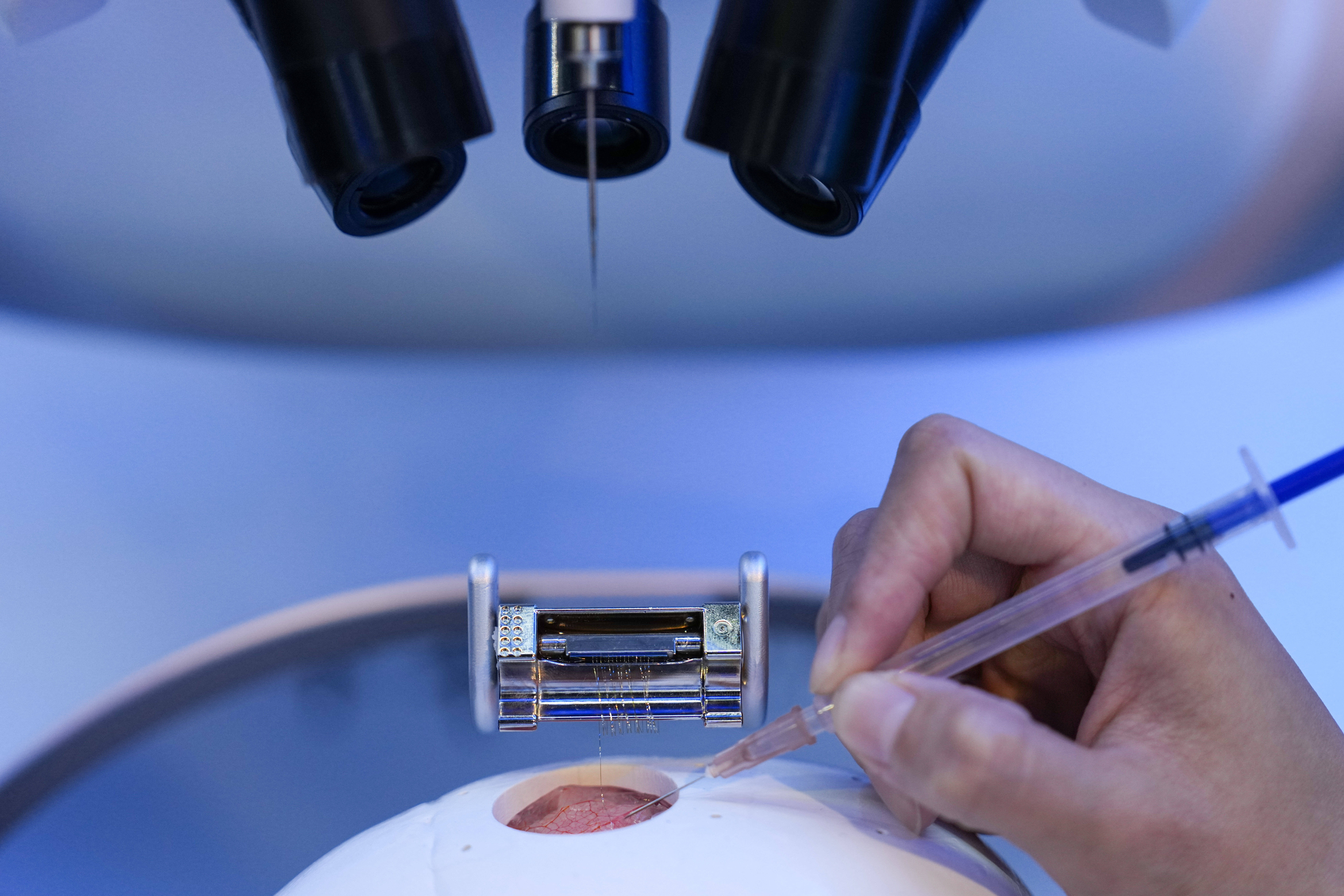 在中关村展示中心常设展上,工作人员在展示一款高通量柔性电(dian)极植入机器人植入的电(dian)极丝(3月(yue)25日摄)。 新华社(she)记者 鞠焕(huan)宗 摄
