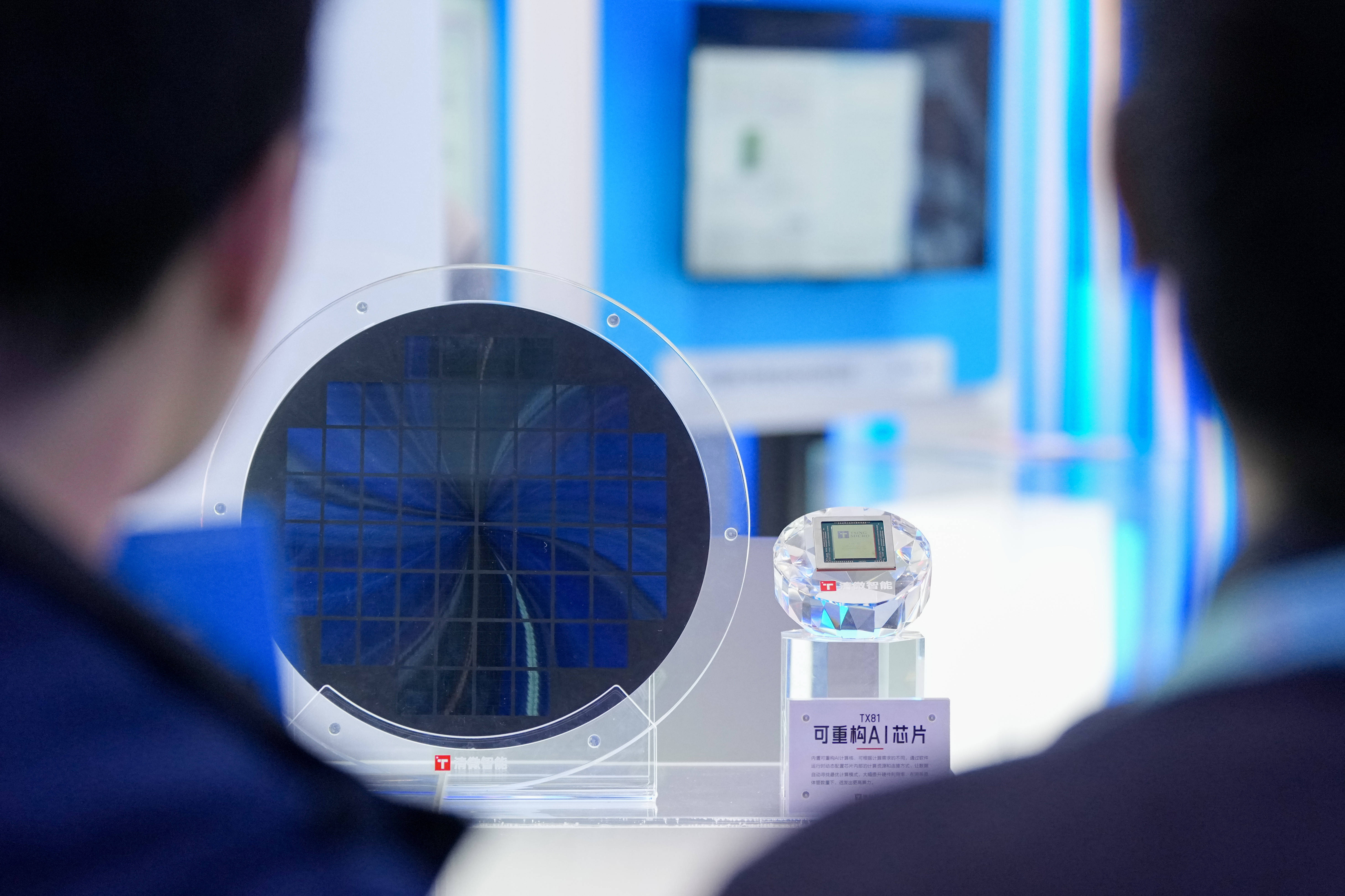 在中关村展示中心常设展上,参观者在了解清(qing)微智能公司(si)展示的可重构AI芯片(3月(yue)25日摄)。 新华社(she)记者 鞠焕(huan)宗 摄
