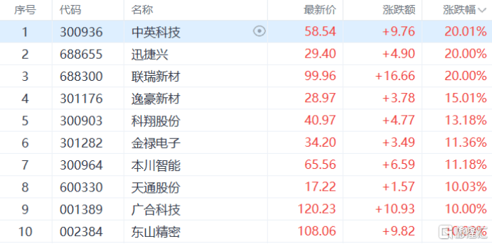 PCB概(gai)念、消耗电子(zi)走(zou)强,中英科技、迅捷兴、联瑞新材等(deng)多(duo)股涨停,逸豪新材涨超15%,科翔股分、金禄电子(zi)等(deng)多(duo)股跟涨。