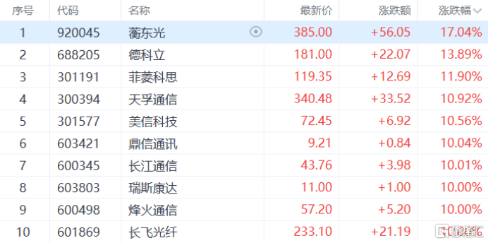 通(tong)讯设(she)备、5G概(gai)念股拉升,长江通(tong)讯、长飞(fei)光纤等(deng)涨停,蘅东光、天孚(fu)通(tong)讯等(deng)多(duo)股跟涨。