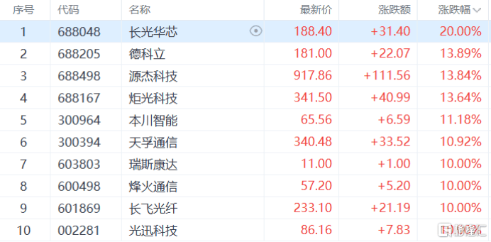 CPO概(gai)念、OpenClaw概(gai)念爆发,光迅科技、长飞(fei)光纤、狼烟通(tong)讯等(deng)多(duo)股涨停,德科立、源杰科技术等(deng)多(duo)股跟涨。