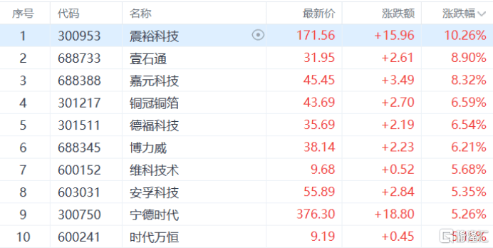 电池板块上涨,壹石通(tong)、嘉(jia)元科技涨超8%,铜冠铜箔、德福科技、宁德期间等(deng)多(duo)股跟涨。