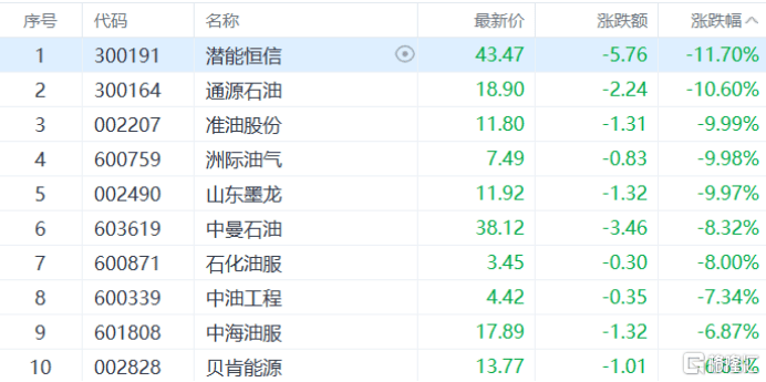 油气设(she)备服务股回(hui)调,准油股分、洲际油气跌停,中曼石油跌超8%,中海油服、中油工程等(deng)多(duo)股跟跌。