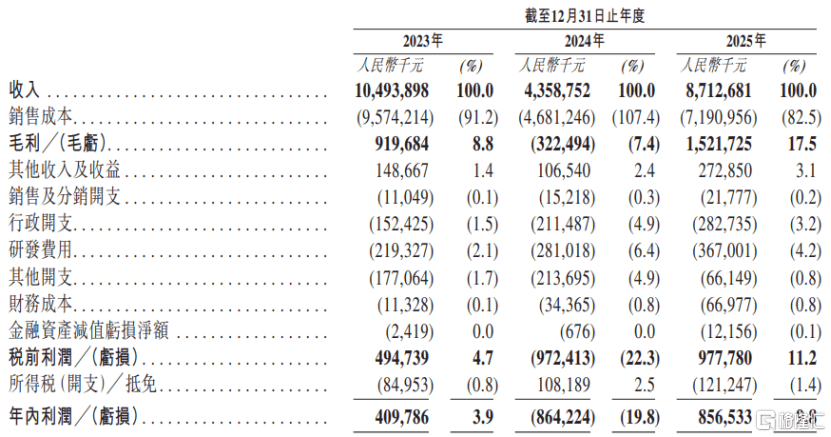 2023年、2024年和(he)2025年,英发睿能的收入分别(bie)约104.94亿(yi)元、43.59亿(yi)元、87.13亿(yi)元,毛利率分别(bie)为8.8%、-7.4%、17.5%,对应的净利润分别(bie)约4.1亿(yi)元、-8.64亿(yi)元、8.57亿(yi)元。