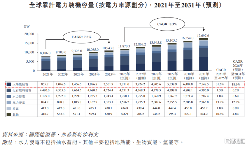 近年来(lai),全(quan)球太阳能累(lei)计装机容量(liang)呈增长(chang)趋向(xiang),2025年达到2561.9GW,预计2031年将达到7548.5GW,2026年至2031年的CAGR为18.6%。
