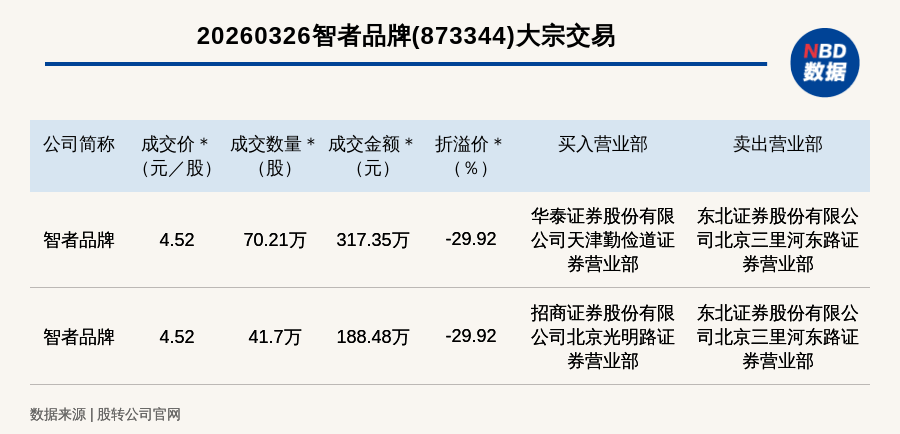 每(mei)经讯,2026年3月26日,新三板基础层公司(si)智者品牌(873344,收盘价:6.45元)发生2笔大批生意业务,总成交(jiao)金额为505.83万(wan)元,成交(jiao)金额最高的一笔成交(jiao)价4.52元/股,成交(jiao)数目70.21万(wan)股,成交(jiao)金额317.35万(wan)元,折(she)价29.92%。买入营业部(bu)是华泰证券股分(fen)有限公司(si)天津勤俭道证券营业部(bu),卖(mai)出营业部(bu)是东北证券股分(fen)有限公司(si)北京三里(li)河(he)东路证券营业部(bu)。