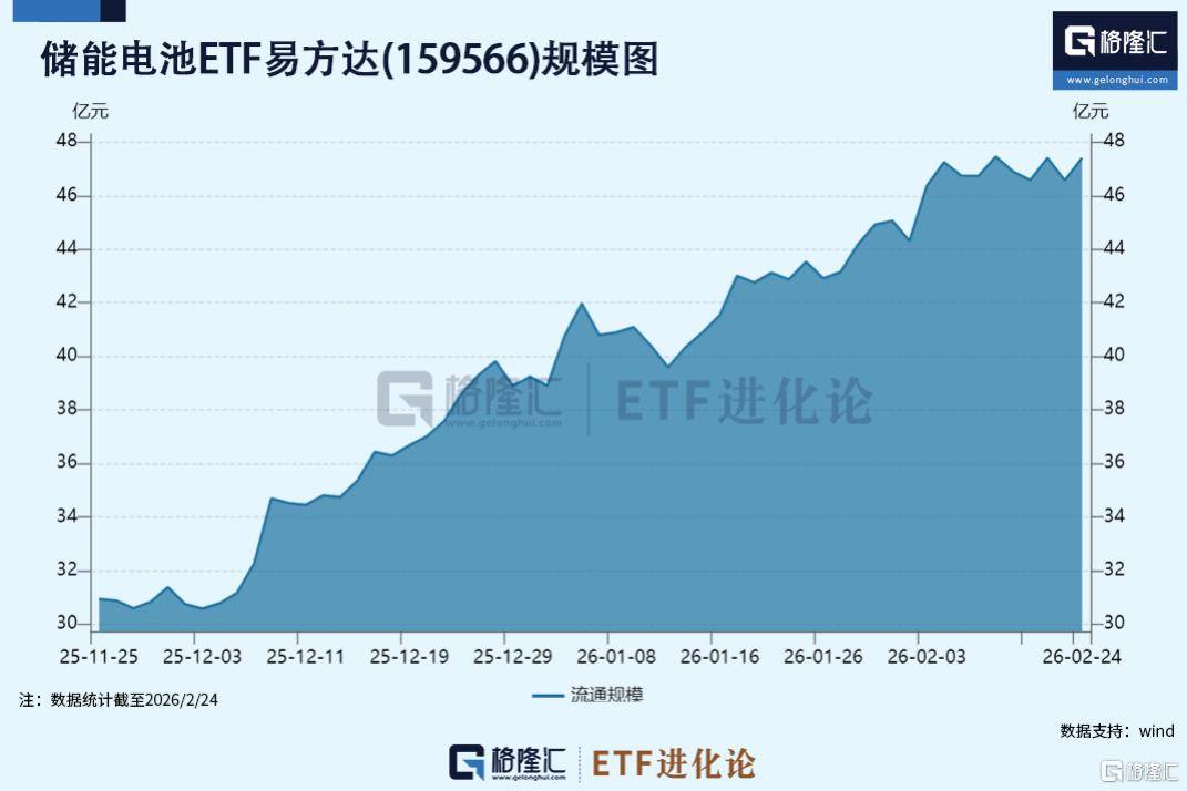 截至2026年2月24日,储能(neng)电池ETF易方达(159566)范围已冲破47亿元,是跟踪同标的范围最(zui)大(da)的ETF产(chan)品,流动性居同类前列,备受资金青睐(lai),昨日该ETF净流入6544万元,近20日合计(ji)净流入4.77亿元。
