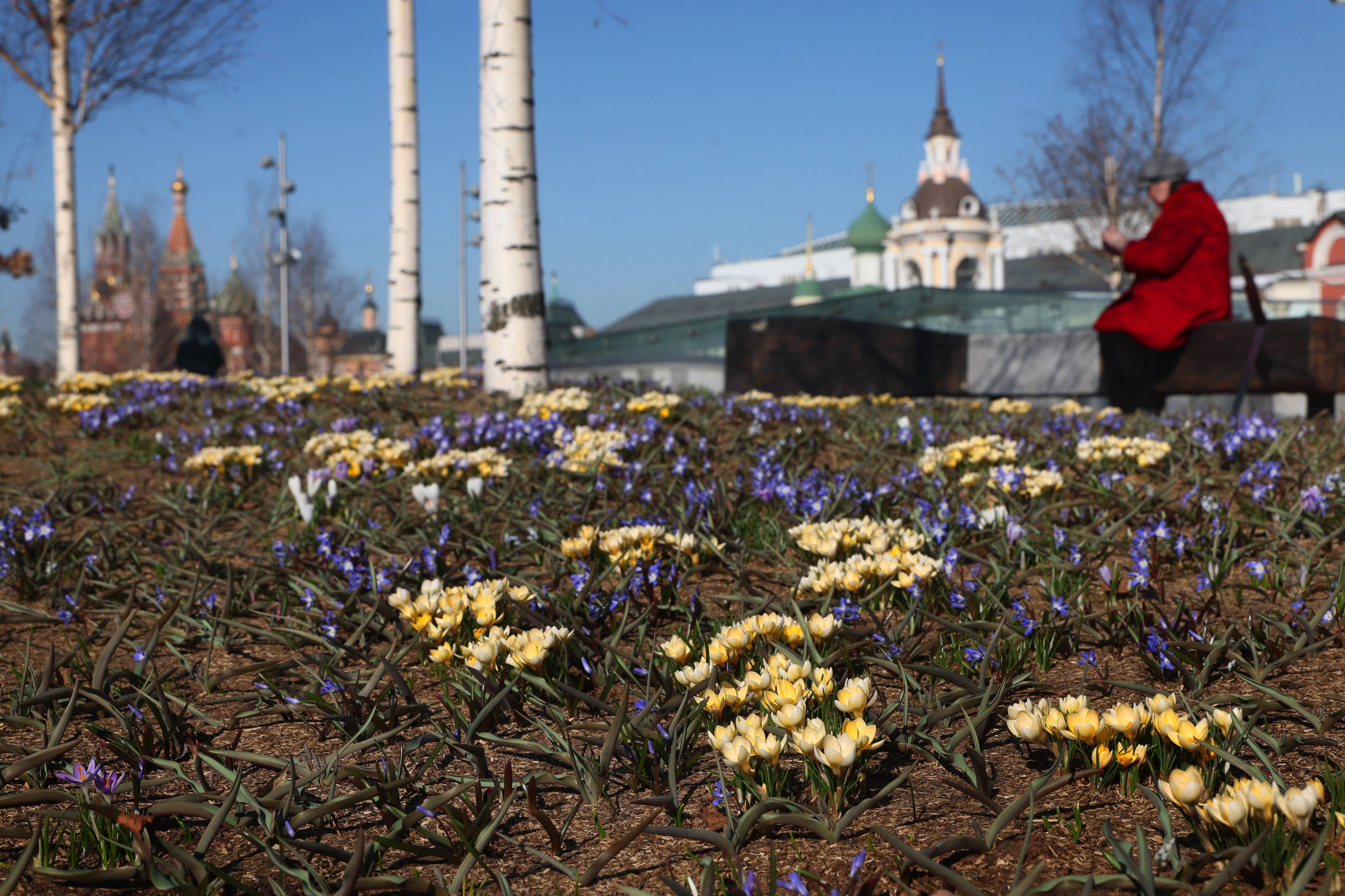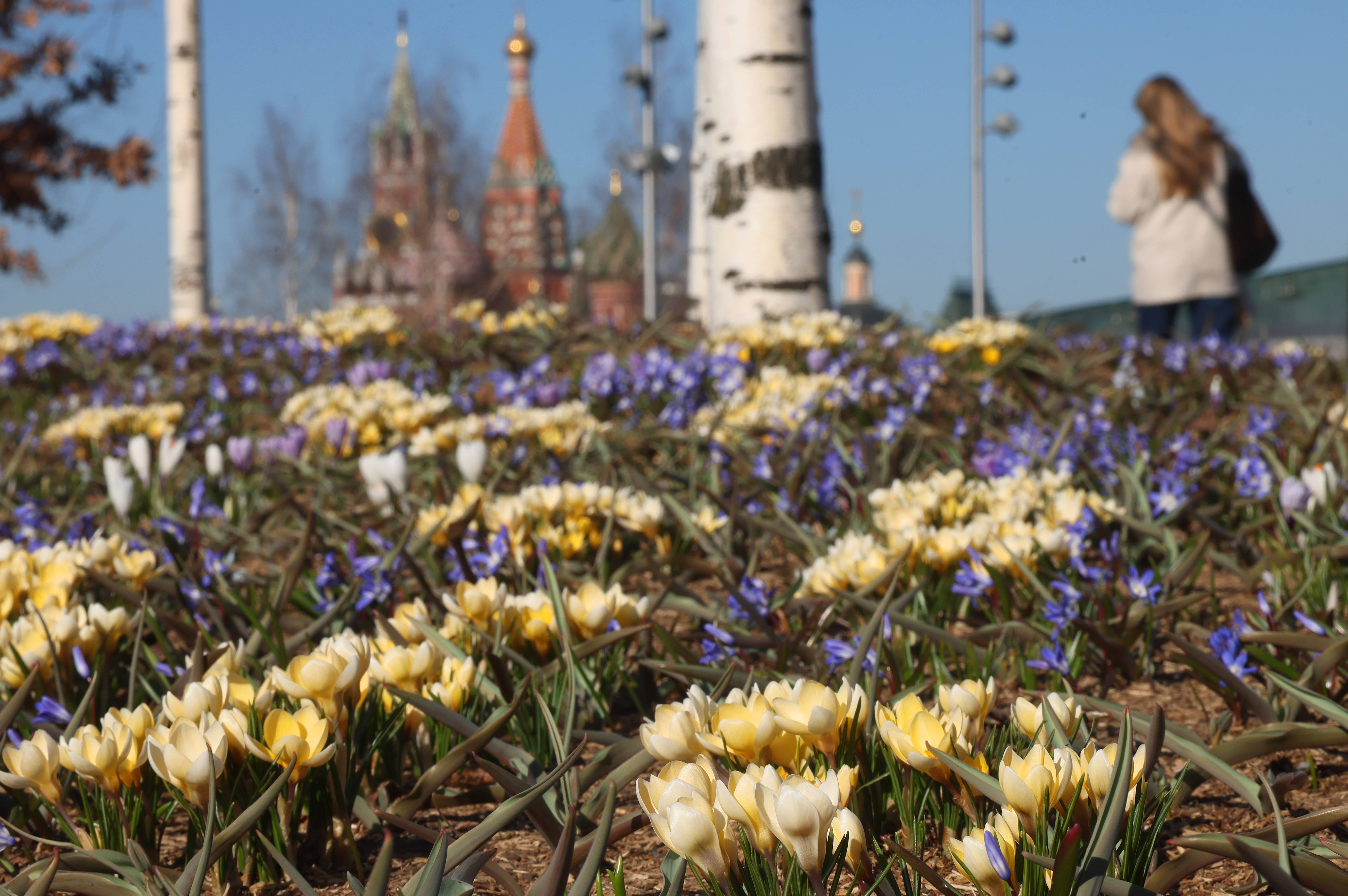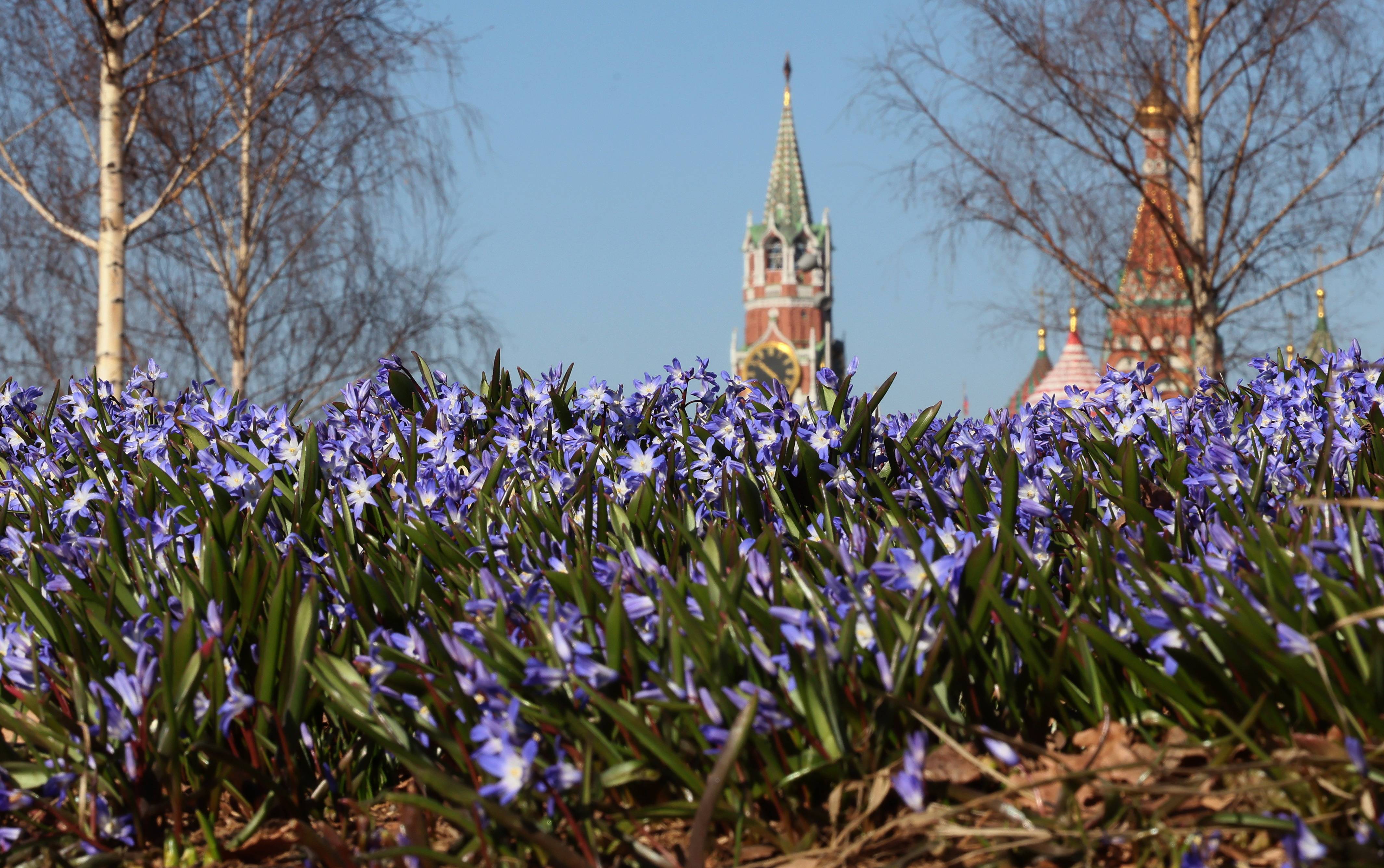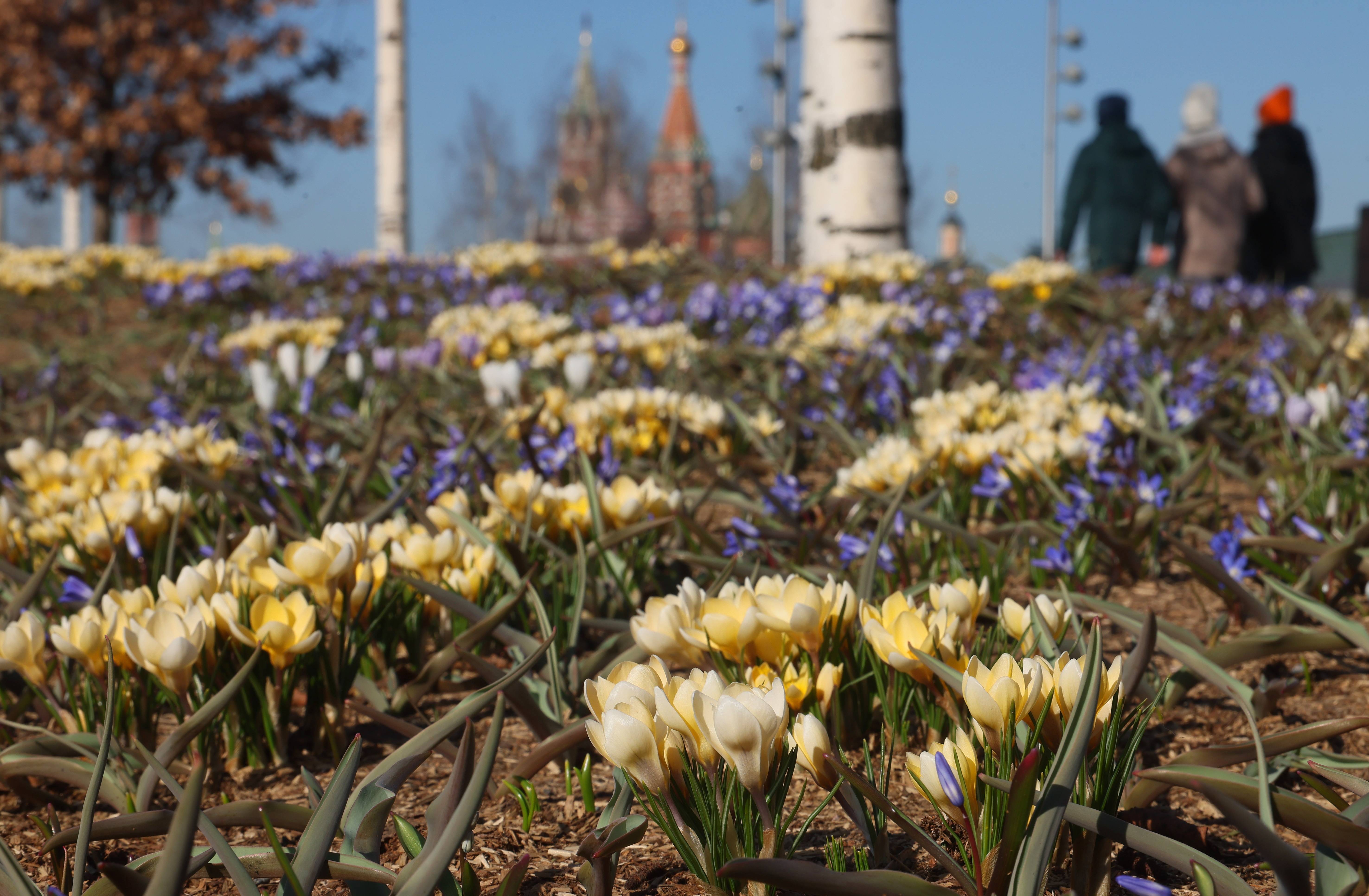 3月24日,在俄罗斯莫斯科克里姆林宫附近的扎里亚杰(jie)公园,初春花朵在阳(yang)光下绽(zhan)放。 新(xin)华社/欧新(xin)