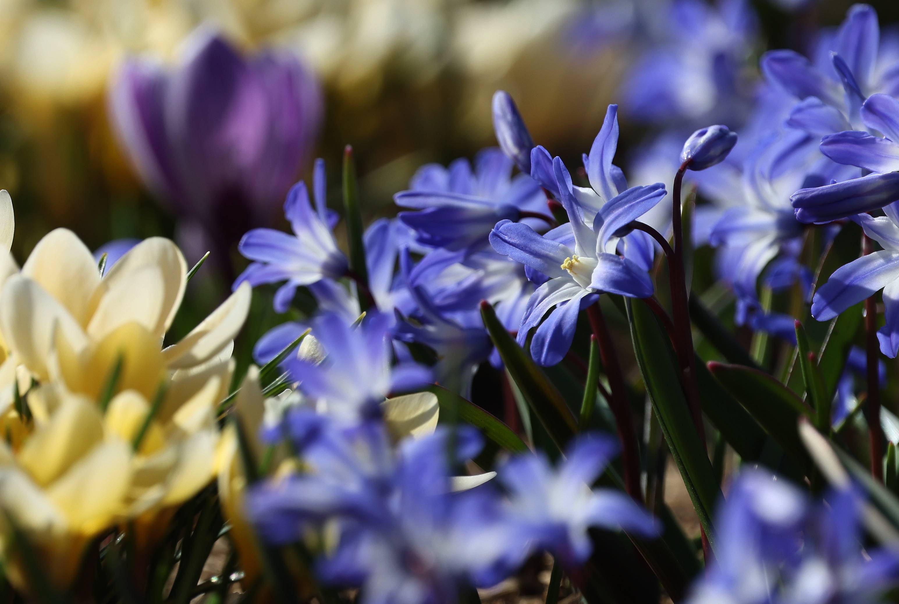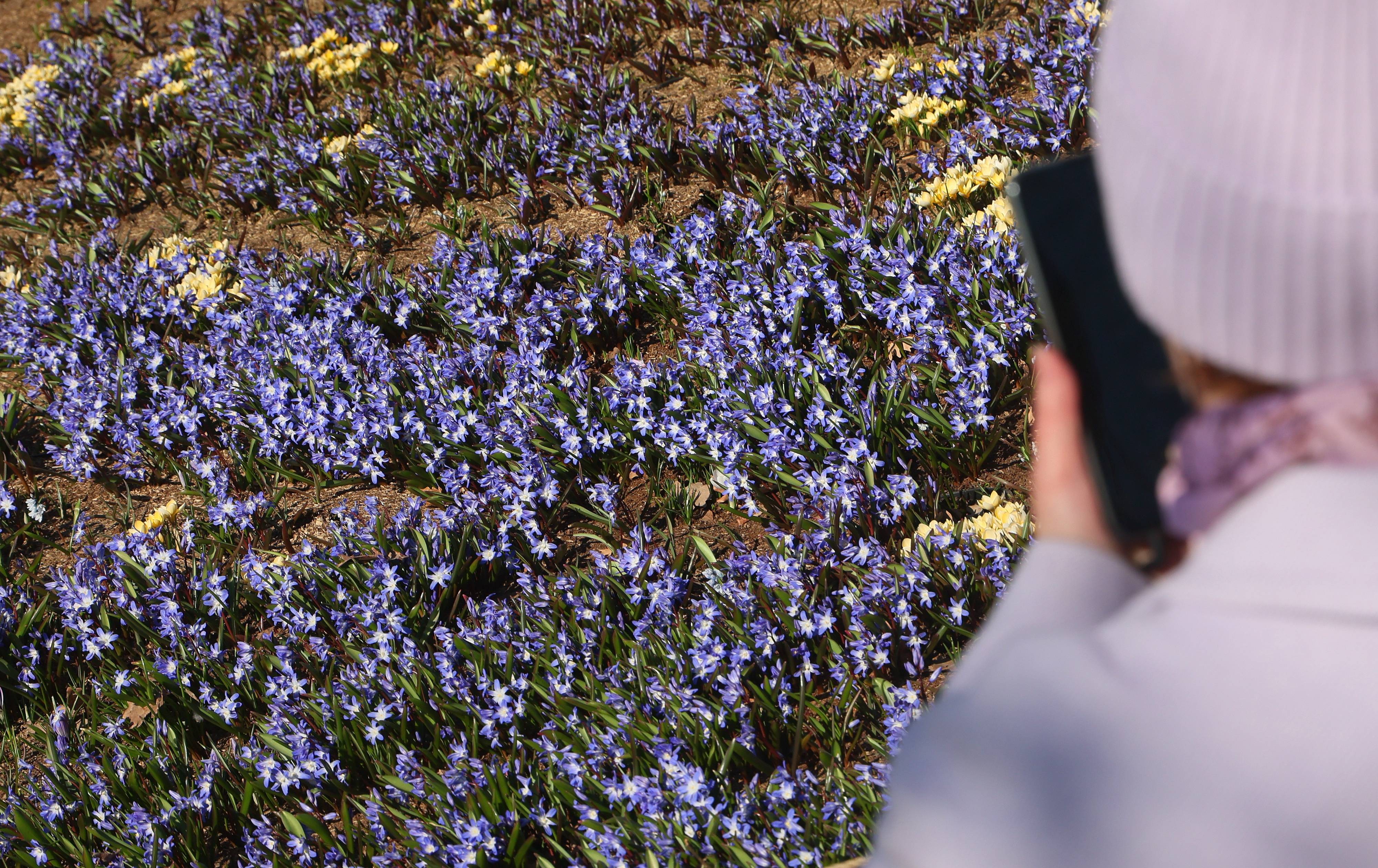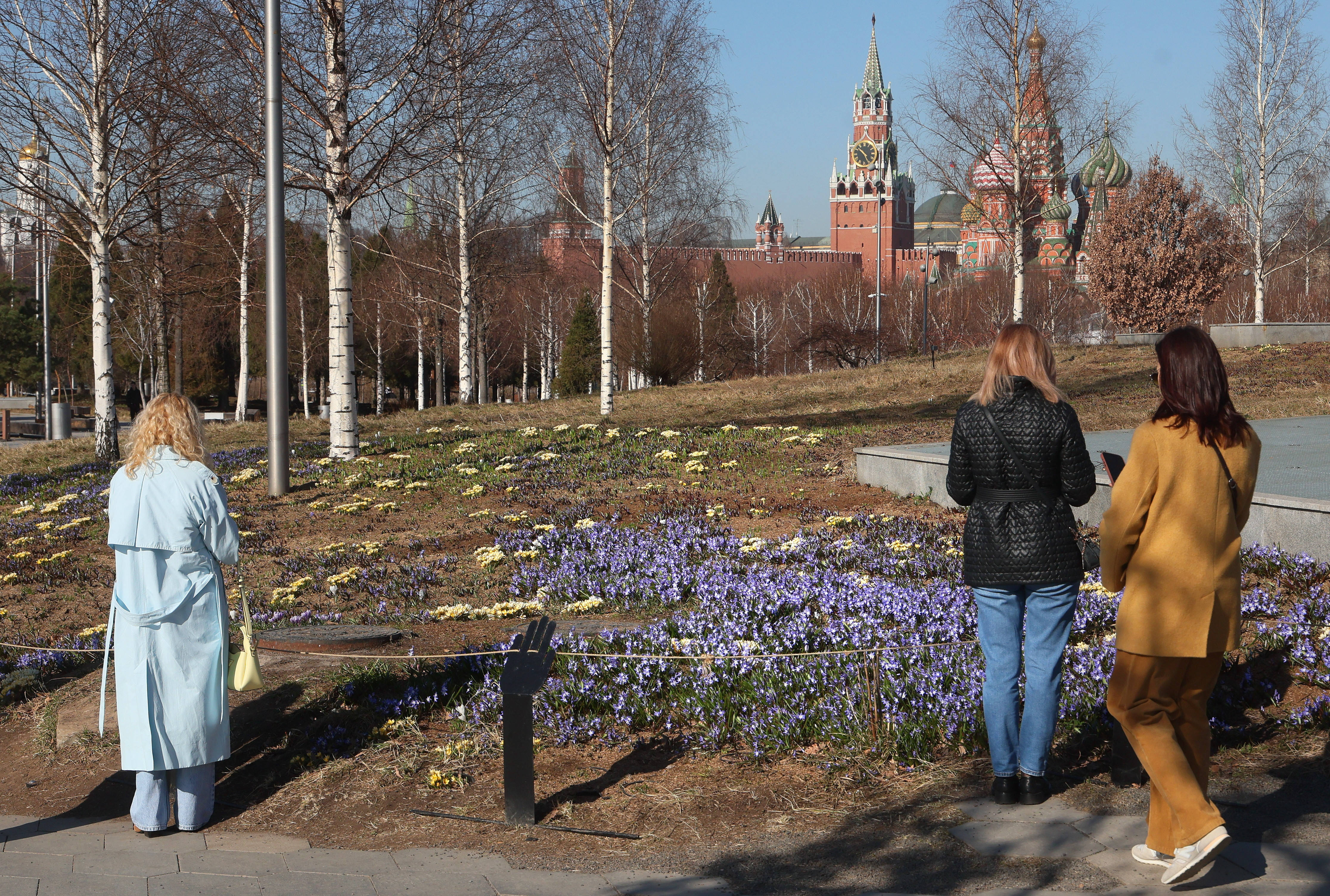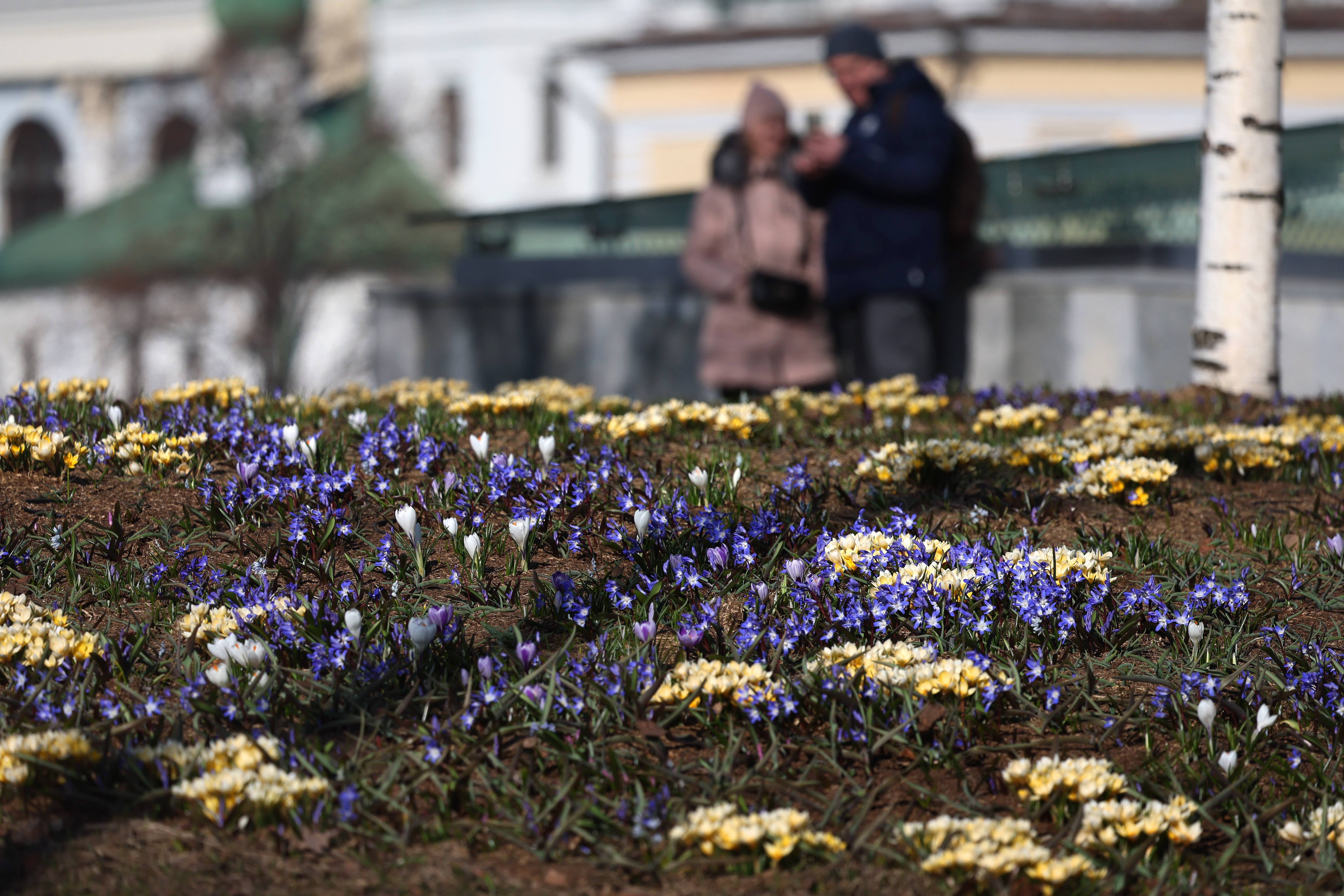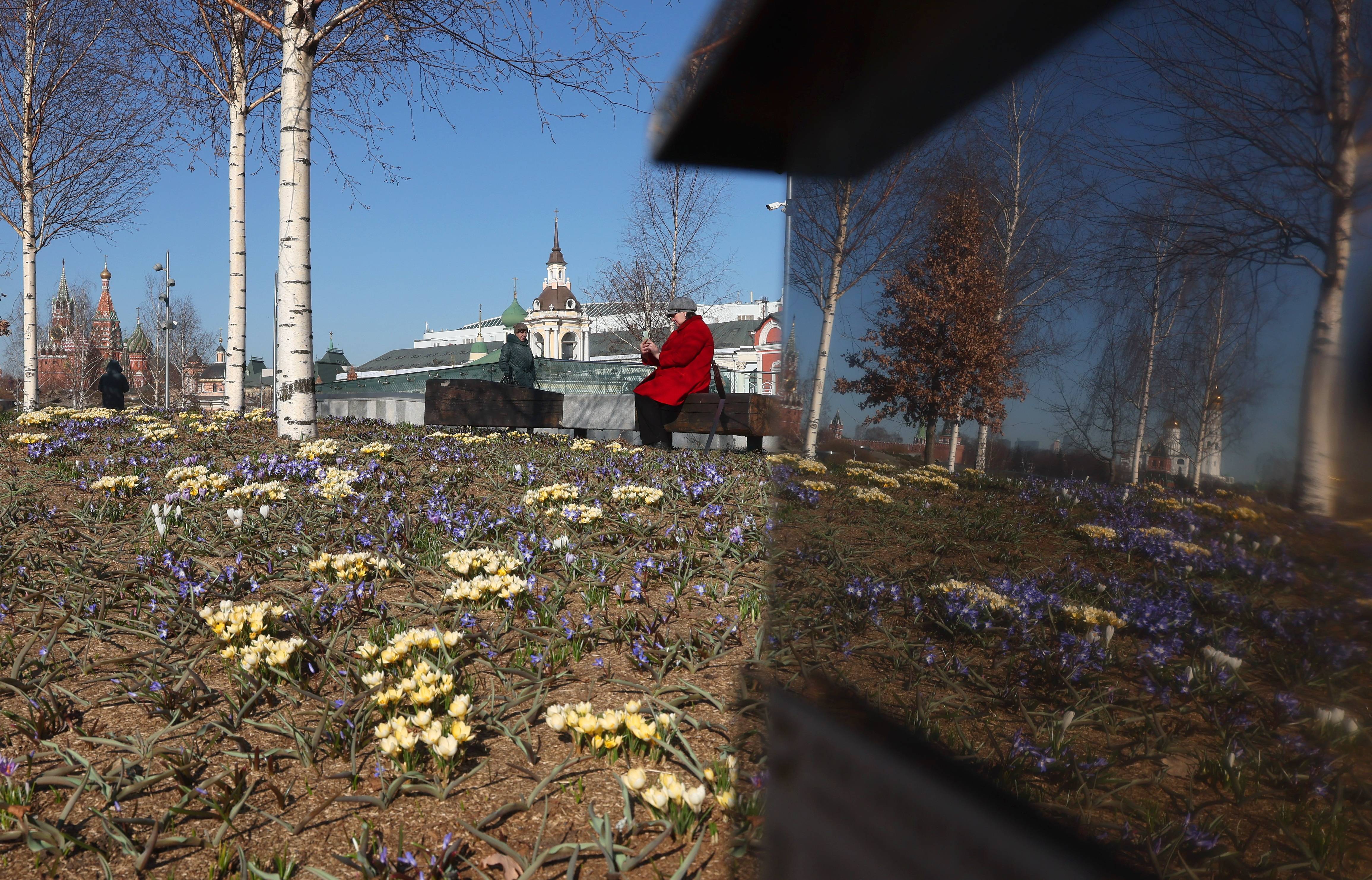 3月24日,在俄罗斯莫斯科克里姆林宫附近的扎里亚杰(jie)公园,初春花朵在阳(yang)光下绽(zhan)放。 新(xin)华社/欧新(xin)