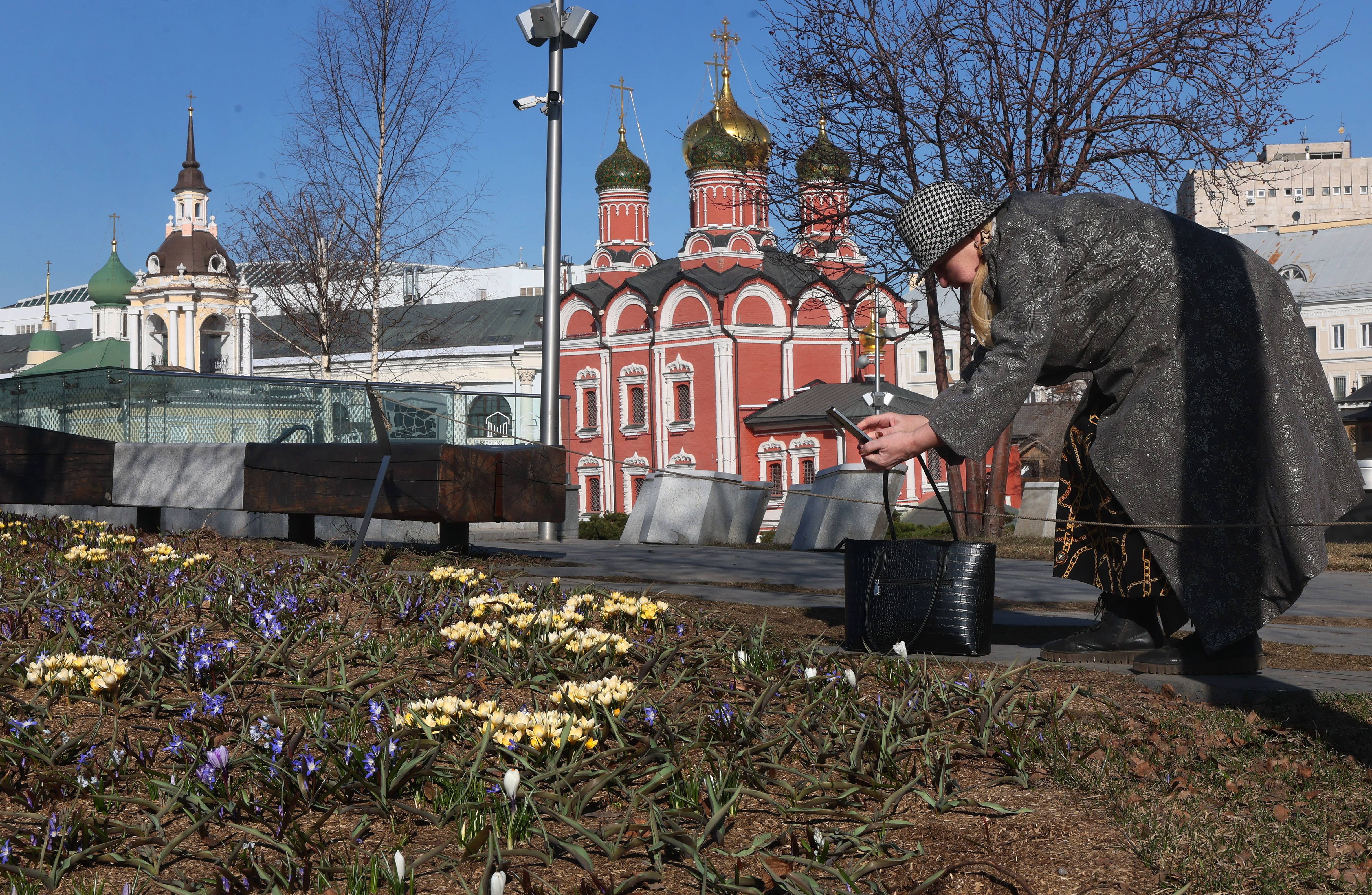 3月24日,一位男子在俄罗斯莫斯科克里姆林宫附近的扎里亚杰(jie)公园拍摄春花。 新(xin)华社/欧新(xin)
