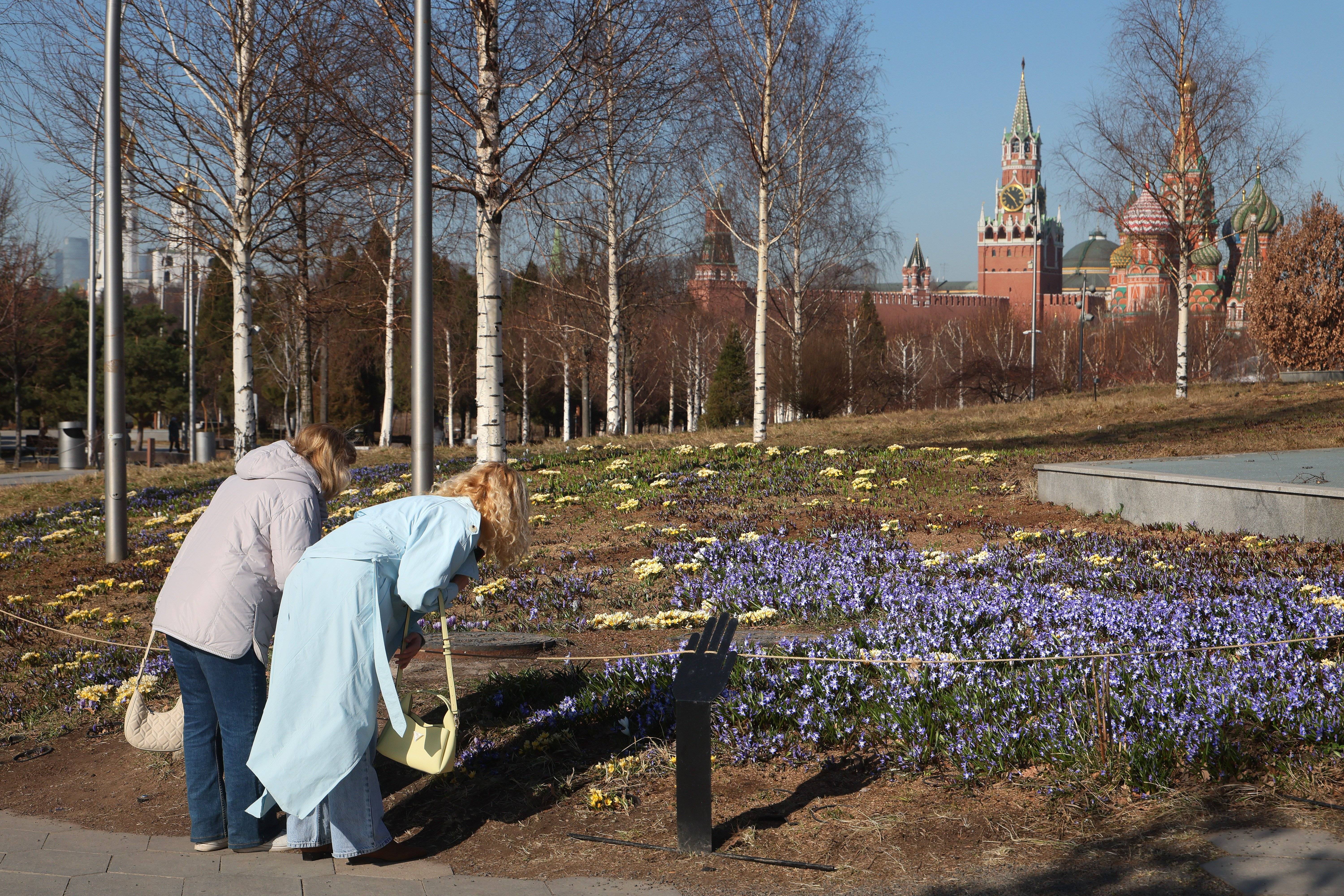 3月24日,人们在俄罗斯莫斯科克里姆林宫附近的扎里亚杰(jie)公园赏花。 新(xin)华社/欧新(xin)