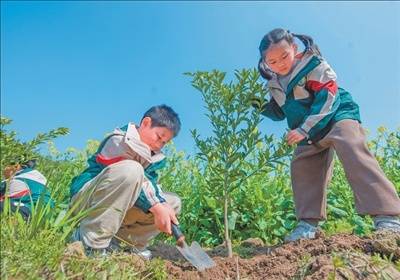 浙(zhe)江省宁波市海曙区,章水镇中心幼儿(er)园将特色“自然课堂”搬进农场,组(zu)织孩子(zi)们亲手种植金橘树苗。 张昊桦摄(影像中国)