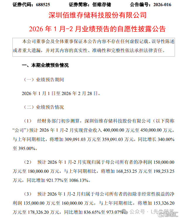 昨晚(wan),国产存储芯片企业(ye)佰维存储披(pi)露2026年1-2月首要谋划(hua)数据,公司(si)归母净利润到(dao)达15亿元至18亿元,同比增进(jin)超(chao)9倍,最高靠近11倍,两个月就赚足(zu)了2025年全年净利润的两倍有余。