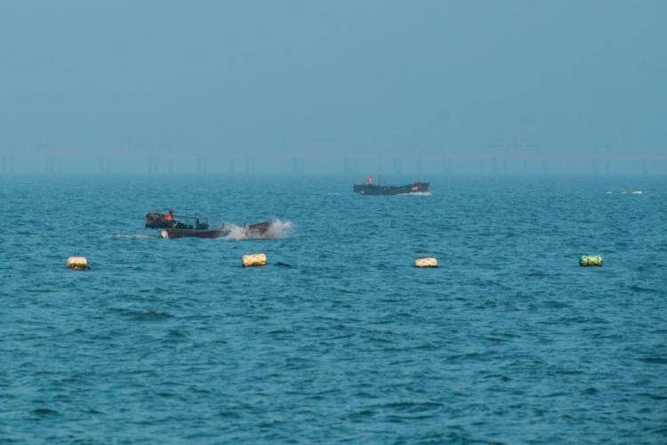江苏省如东县长(chang)沙镇的渔民(min)驾(jia)船捕捞鳗鱼苗(miao)。