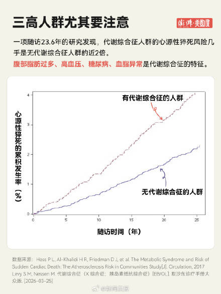 患有代谢综合征的人群,尤其值要警惕。一(yi)项长达 23.6 年的随访研究(jiu)发现,这类人群发生心源性猝死的风险(xian),几乎是健(jian)康人群的2 倍。腹型肥胖、高血压(ya)、高血糖、血脂异常等 “三高” 问题相互叠加,长期累积的代谢负担,很可能最终(zhong)诱发致命的猝死事件。