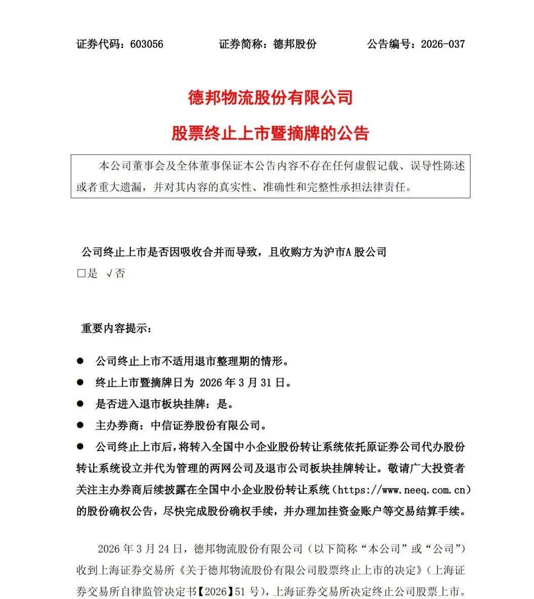 德邦股份3月25日晚间通告,上交所赞同公司(si)按照相关(guan)规(gui)定主动撤回公司(si)股票正在该(gai)所交易(yi),同时决定终(zhong)止公司(si)股票上市。