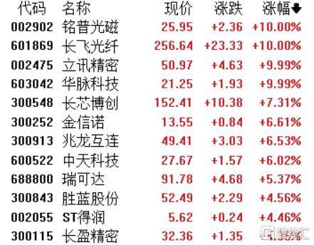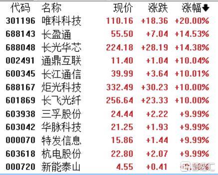 光纤概念股走强,唯科科技20CM涨(zhang)停,长盈(ying)通、长光华芯涨(zhang)超14%,通鼎互联(lian)、长江通信(xin)、炬光科技、长飞光纤等(deng)多股涨(zhang)停。
