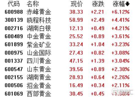 贵(gui)金属股下跌,赤(chi)峰黄金涨(zhang)超6%,晓程(cheng)科技、湖南白银、中金黄金、紫金矿业、山金国际、四川黄金、山东黄金等(deng)跟涨(zhang)。