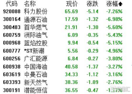 油气开采及服务板块走弱,科力股份跌超7%,通源石油、首华燃气、洲际油气、蓝焰控股、广汇能源、中国海油等(deng)跟跌。