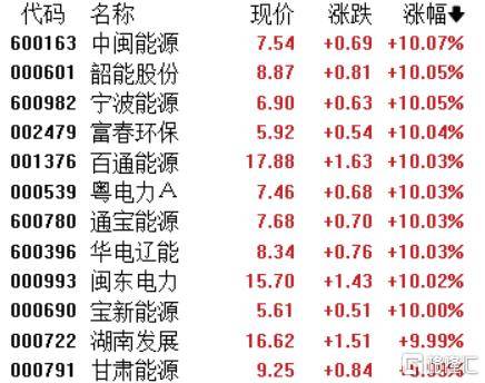 电力股爆发涨(zhang)停潮,中闽能源、韶能股份、宁波能源、富春环保、百通能源、粤(yue)电力A、通宝能源、华电辽能等(deng)多股涨(zhang)停。