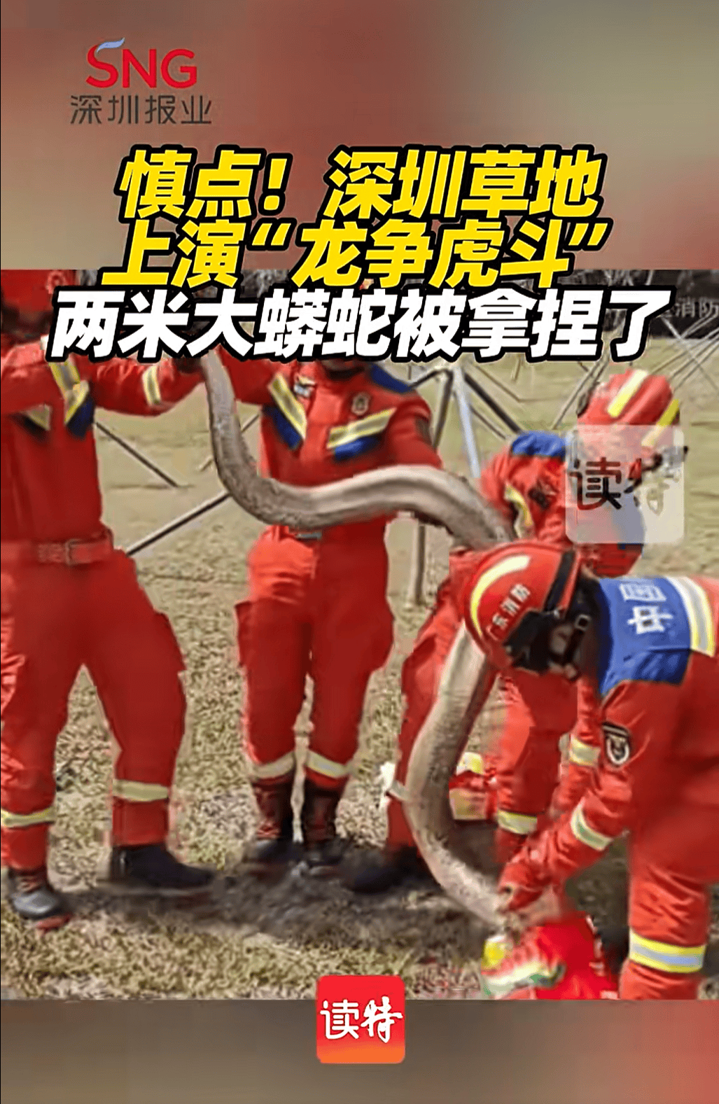 四人合力才将蟒蛇装(zhuang)入编织袋中