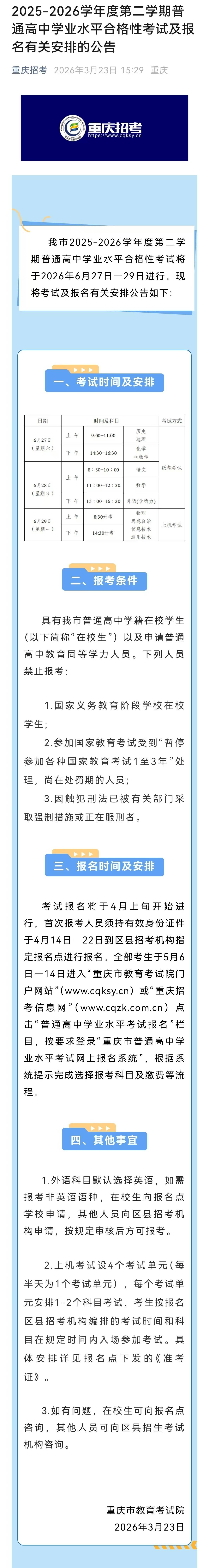 3月23日(ri),重庆(qing)市教育测验院公布通告,2025-2026学年度第二学期平凡高中学业程度合格性测验将于2026年6月27日(ri)至29日(ri)进(jin)行。