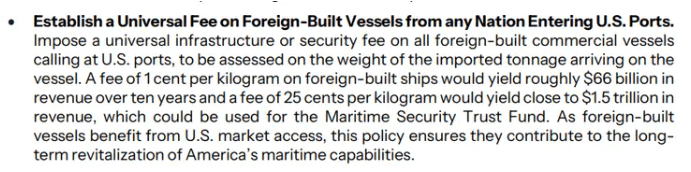 第三支柱是保护海事(shi)工业基础,核心逻辑是从需(xu)求侧入手(shou),为外乡船(chuan)厂(chang)锁定(ding)市(shi)场(chang)。MAP建立(li)"美国海事(shi)优先要求"机制,随着外乡新船(chuan)陆(lu)续下(xia)水,逐(zhu)步强(qiang)制要求主要出口国将(jiang)更高比(bi)例的对美货物转移至美国船(chuan)只运输,这相当(dang)于(yu)经过(guo)行政手(shou)段为外乡船(chuan)队保底(di),以制度性保护替代纯真的财务补(bu)助。同时,MAP专门设计了(le)针对货主绕道加拿大、墨(mo)西哥陆(lu)路出境、躲避美国港口保护费的堵漏机制。