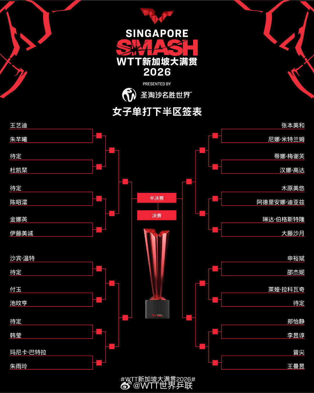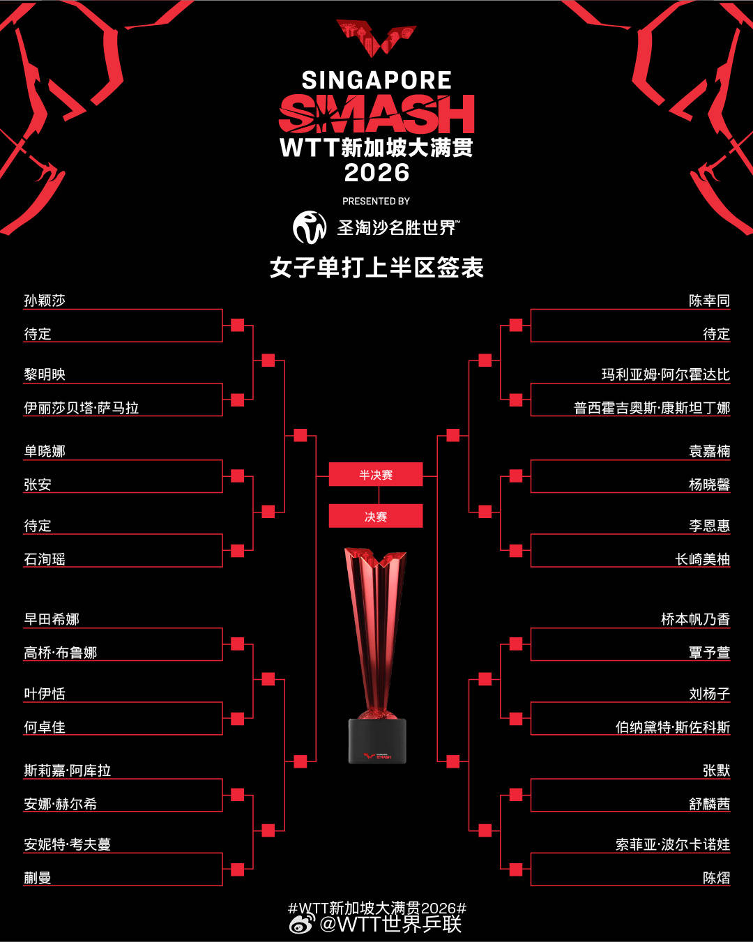 北京时(shi)候2月20日,2026WTT新加坡大满贯抽签仪式(shi)进行。女单方面(mian),孙颖莎首轮对手待定,蒯曼对阵(zhen)考夫蔓,上半区(qu)国乒女单多达7人;下半区(qu)王曼昱对阵(zhen)曾尖,或正在1/4决赛遭受张本美和。
