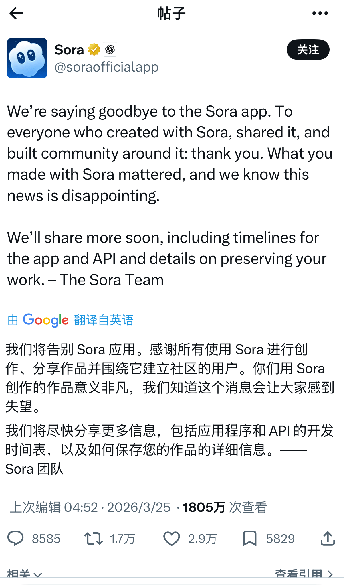 风靡(mi)一时的AI视频(pin)生成工具(ju)Sora画上停止符。3月25日(ri),OpenAI旗下视频(pin)生成产(chan)物Sora宣布将全面关停,包括APP、API及ChatGPT内嵌视频(pin)生成功能。这个决定看起(qi)来十分突然,就在3月13日(ri),Sora还进行了更新,宣布推出新的视频(pin)API功能。
